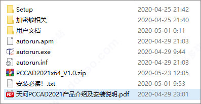 1、知识兔将winwin7分享的天河pccad2021中文版压缩包解压出来得到安装程序“autorun.exe”和附带的文件;