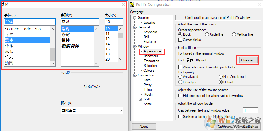 1、打开Putty,知识兔点击“Window”下的“Appearance”选项,知识兔点击“Font settings”后的“Change”按钮。这样会打开字体设置窗口,知识兔选择一款中文字体,然后知识兔在下方“脚本”栏中选择“中文_GB2312”。