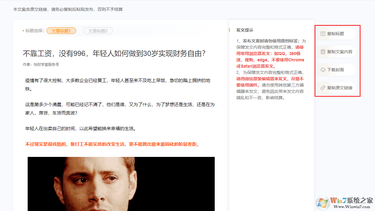 分别复制文案的标题、内容、原文链接(如有的话)和下载封面,将对应素材放置在微信公号后台素材库中,即可发布。