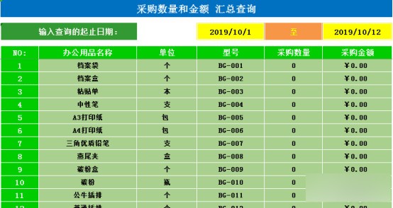表格自带了一些示例数据,主要在:公办用品信息、采购录入、领用录入、期初库存等,可清除或改为自己的数据。