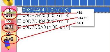 出现查找结果,鼠标右键选择其中一个,出现add、relist、edit3个选项。Add的意思就是进入该内存段的具体修改界面;relist的意思是重新列出查找结果;edit的意思是进入16进制编写的内存页面进行编辑。
