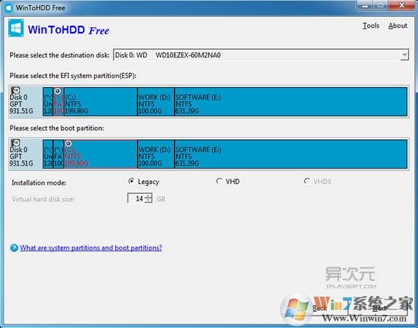 一般来说,WinToHDD 会自动从分区列表出选择好引导分区以及系统分区,选中的分区会以红框标识出来。