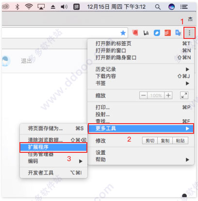 1.知识兔下载完成后,按下图所示在浏览器右上角 打开“扩展程序”页面。