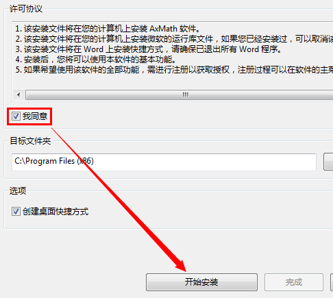 如果知识兔在您的电脑上不能正常打开,则需要运行 Setup.exe 来安装组件,知识兔打开组件安装程序,勾选【我同意】后,知识兔点击【开始安装】,等待安装完成,再启动 AxMath.exe,即可
