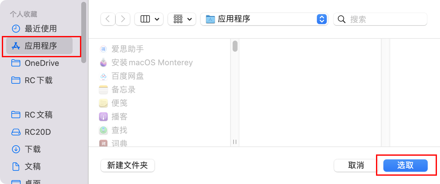 然后知识兔弹出选择框时候,知识兔选择 应用程序 文件夹,最后知识兔点击“选取”完成。