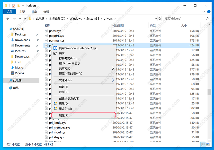 1.现在知识兔按command + E打开windows10 资源管理器,进入C:\Windows\System32\drivers文件夹,找到pci.sys,对着pci.sys右键–属性打开;